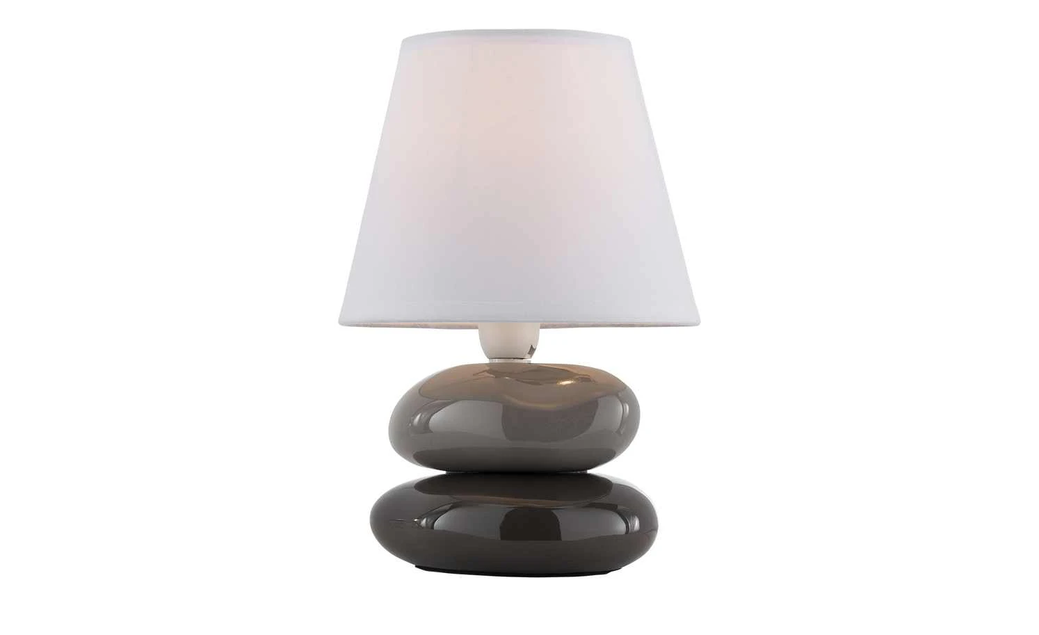 Zwei wie rund geschliffene Steine anmutende Elemente bilden einen stabilen Sockel für diese Tischleuchte, die mit einem farblich dazu passenden Stoffschirm geschmackvoll gestaltet ist. Die Leuchte strahlt Harmonie aus und passt zu einem modernen Ambiente ebenso gut wie zu einem klassischen. Das energiesparende Leuchtmittel wird über einen Kippschalter bedient und verleiht dem wohnlichen Umfeld eine warme Beleuchtung.