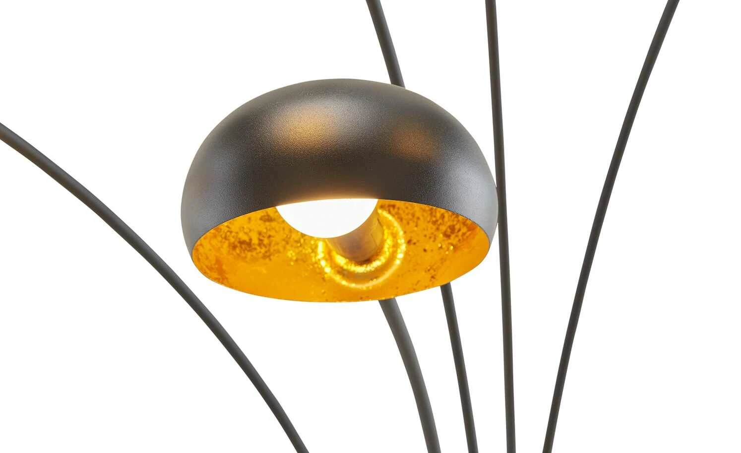 Betont dekorativ und stilvoll präsentiert sich diese fünfflammige Bogenleuchte. In klassischem Schwarz gestaltet integriert sie sich auf elegante Weise in Ihre bereits vorhandene Einrichtung. Der Schirm ist im Inneren goldfarben, was das Bild gekonnt abrundet. Bedient wird die Leuchte über einen praktischen Fußschalter.