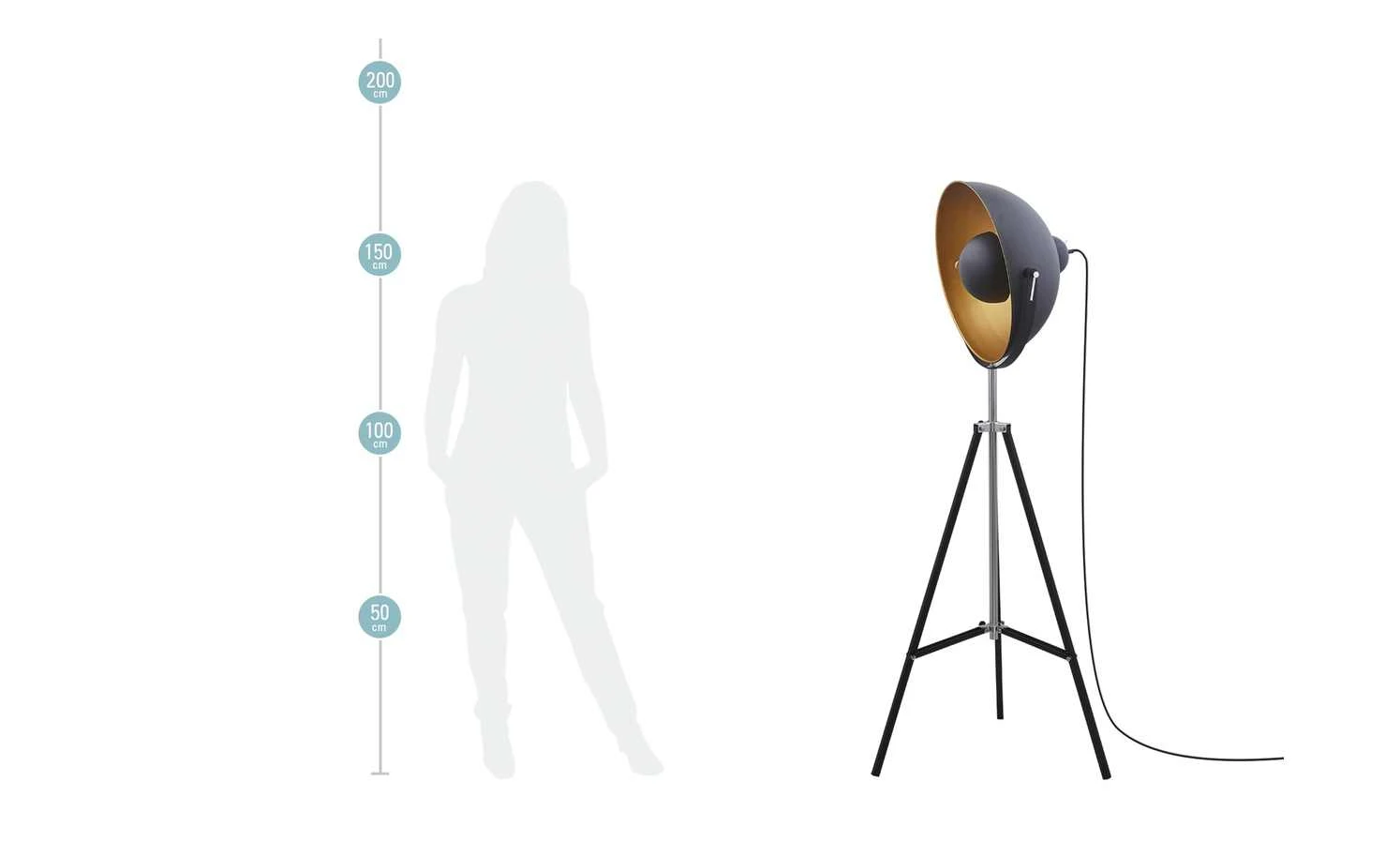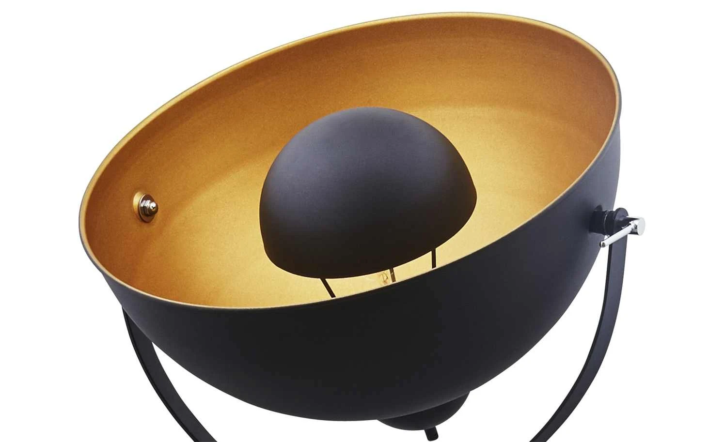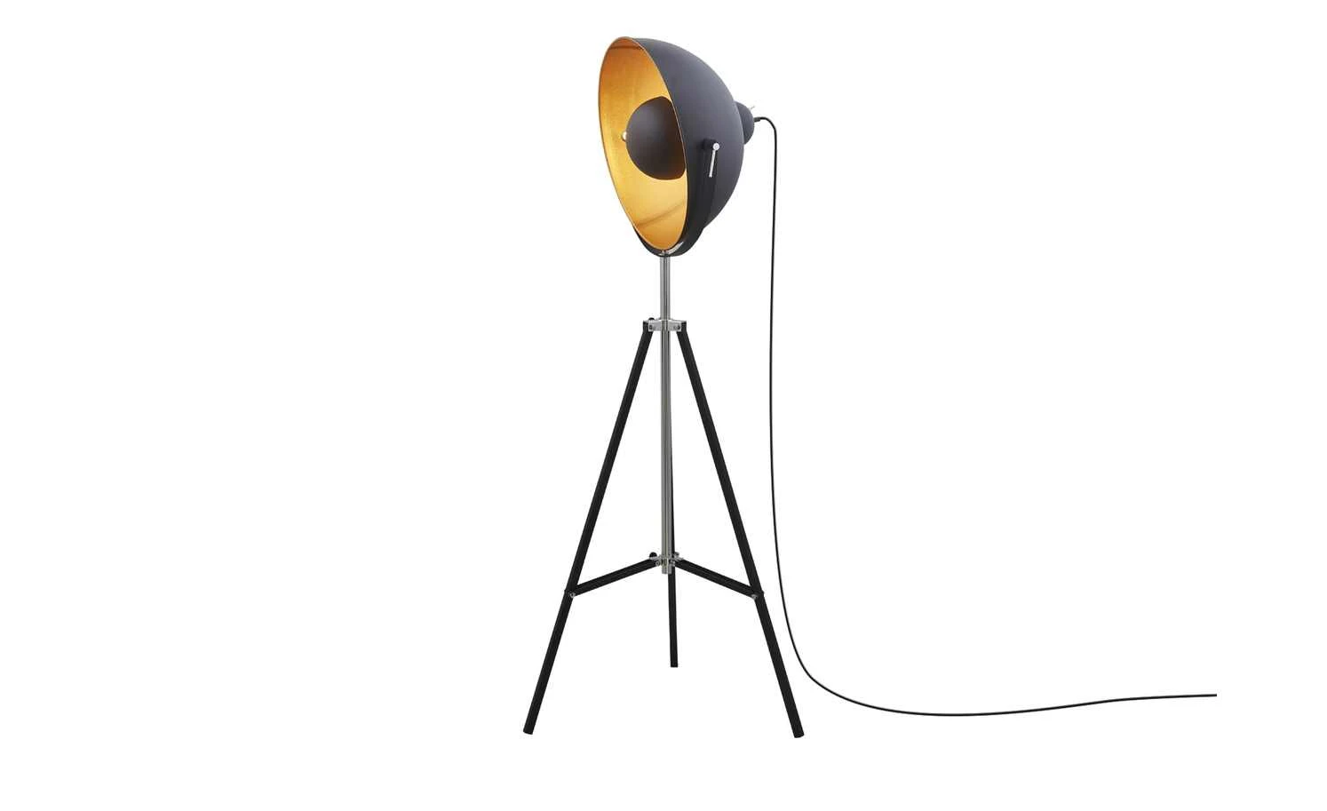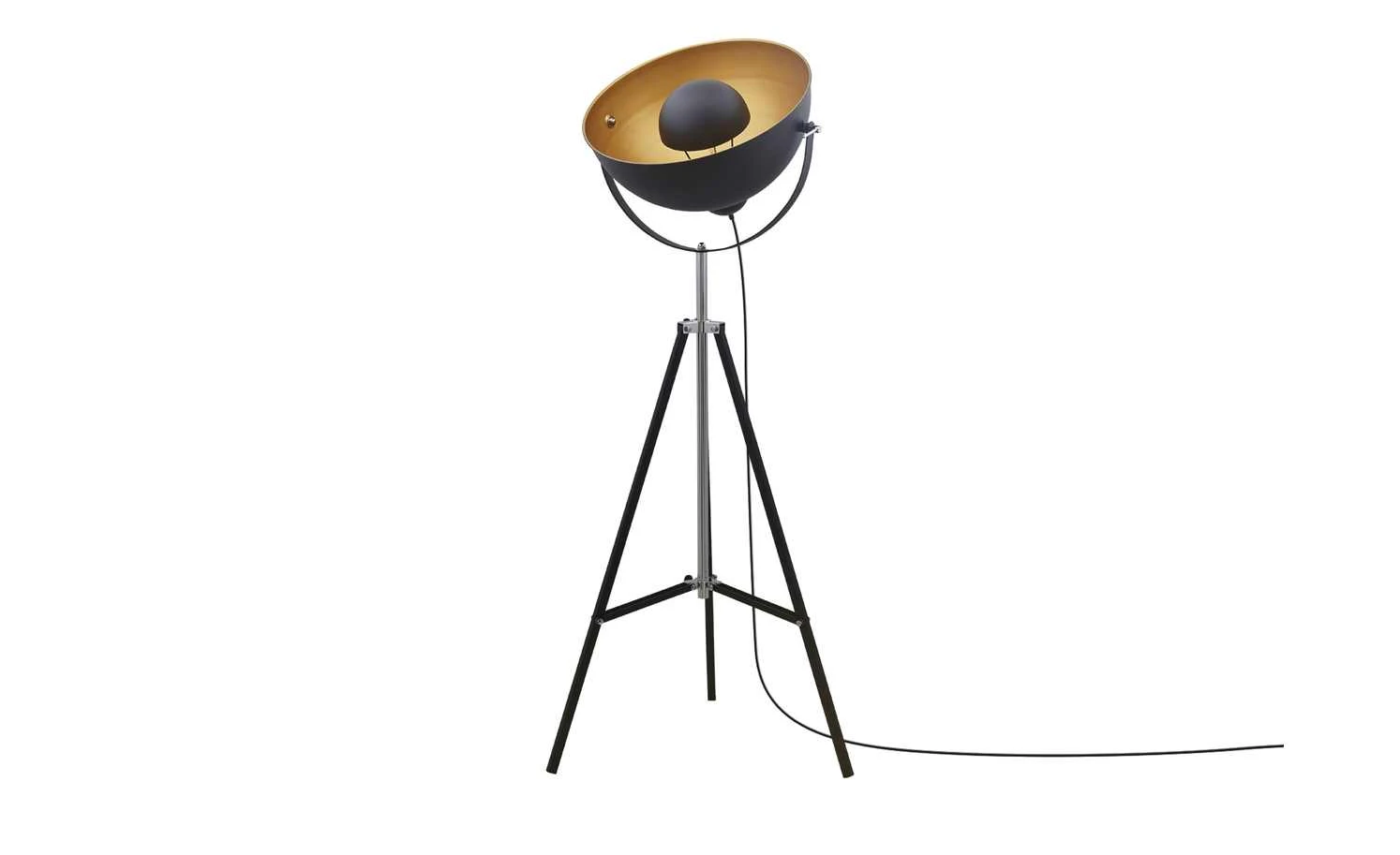 Sorgen Sie für stimmungsvolles Ambiente mit der Dreibein-Stehleuchte von HOME STORY. Die goldfarbene, matte Innenseite des Lampenschirms macht die Stehlampe im Industrial-Style zu einem echten Eyecatcher. Genießen Sie das besondere Lichtspiel und erschaffen Sie ein einzigartiges Ambiente: Der Lampenschirm lässt sich dazu ganz leicht drehen und schwenken. Der große Lampenschirm mit ganzen 50 Zentimetern Durchmesser ist an der Außenseite mattschwarz lackiert und besitzt einen dezenten Kippschalter an der Rückseite. Die 165 Zentimeter hohe Studiolampe steht auf einem mattschwarzen Metallstativ und erinnert an Scheinwerferlampen in Fotostudios.
