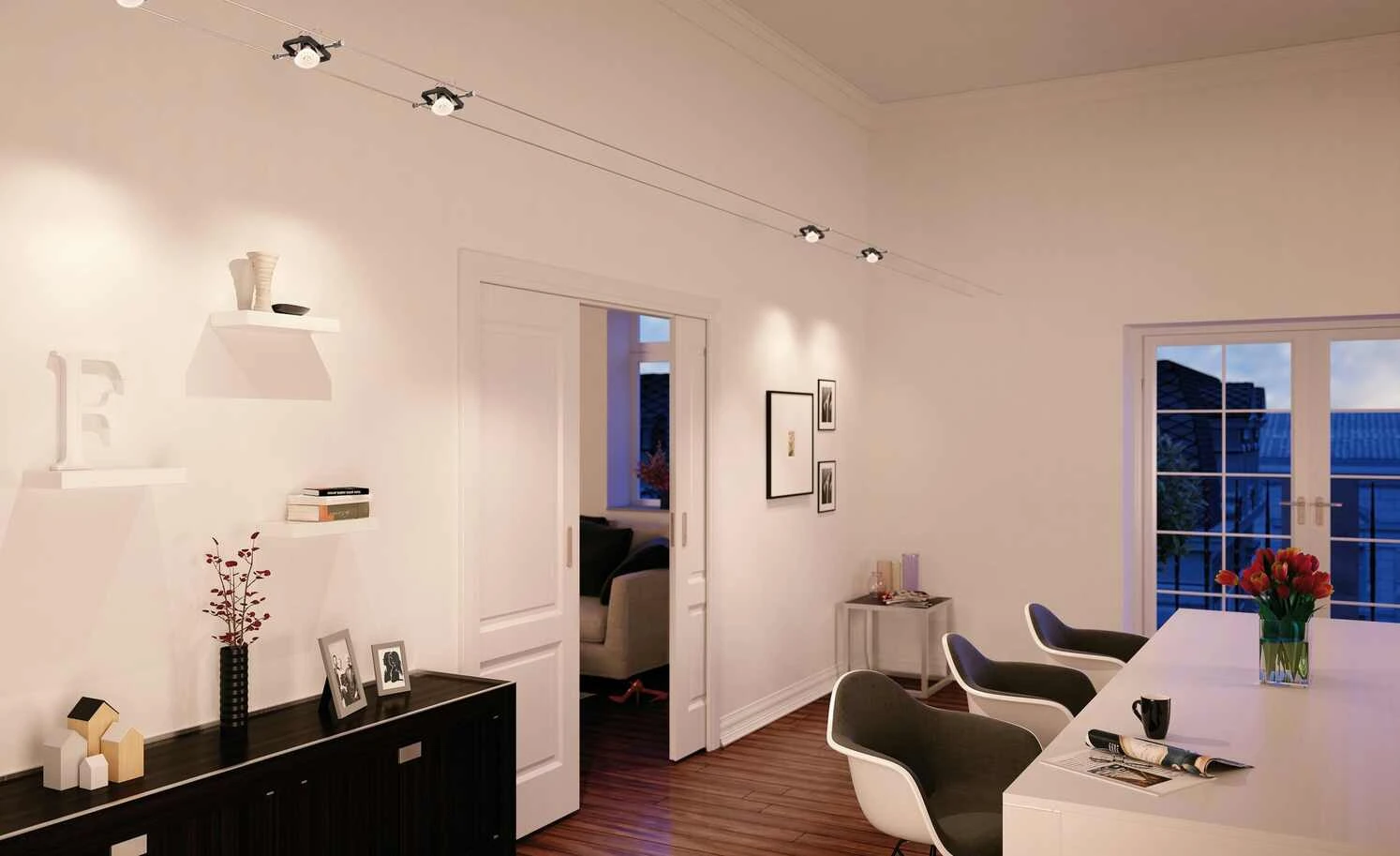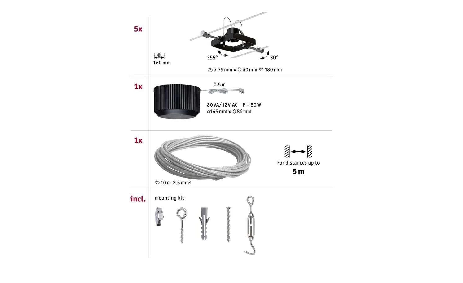 - Lieferumfang / mitgeliefertes Zubehör: Seil und Spots, Trafo 80VA, 230/ 12V