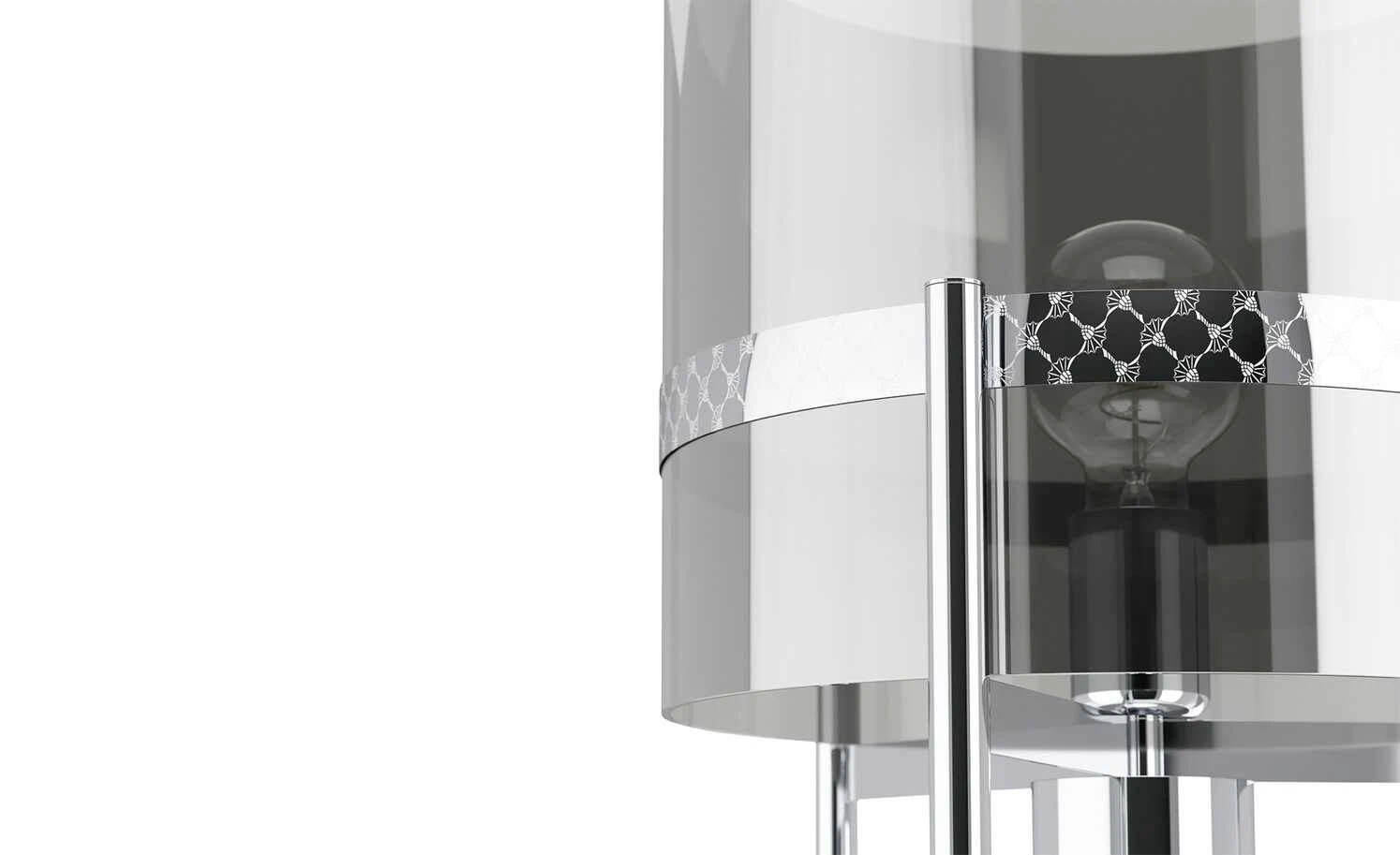 - Mehr zum Material: Metall-Untergestell in Chrom-Optik, runder Fumé-Glasschirm aus Borosilikatglas