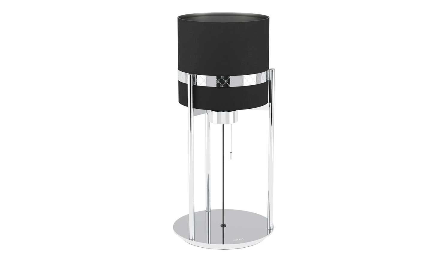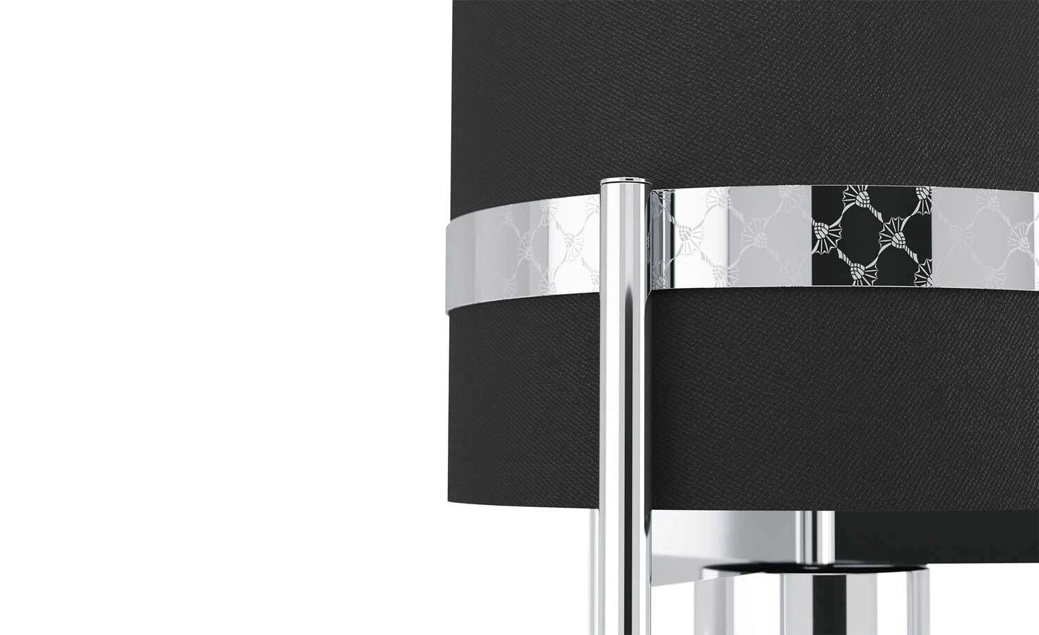 - Mehr zum Material: runder Textil-Leuchtenschrim in Schwarz mit Dekorband, rundes Metallgestell in Chrom-Optik