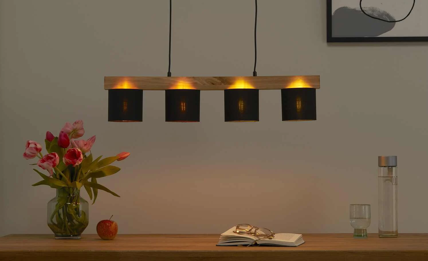 Trio Pendelleuchte, 4-flammig, Holz/ Stoffschirm schwarz/goldfarben