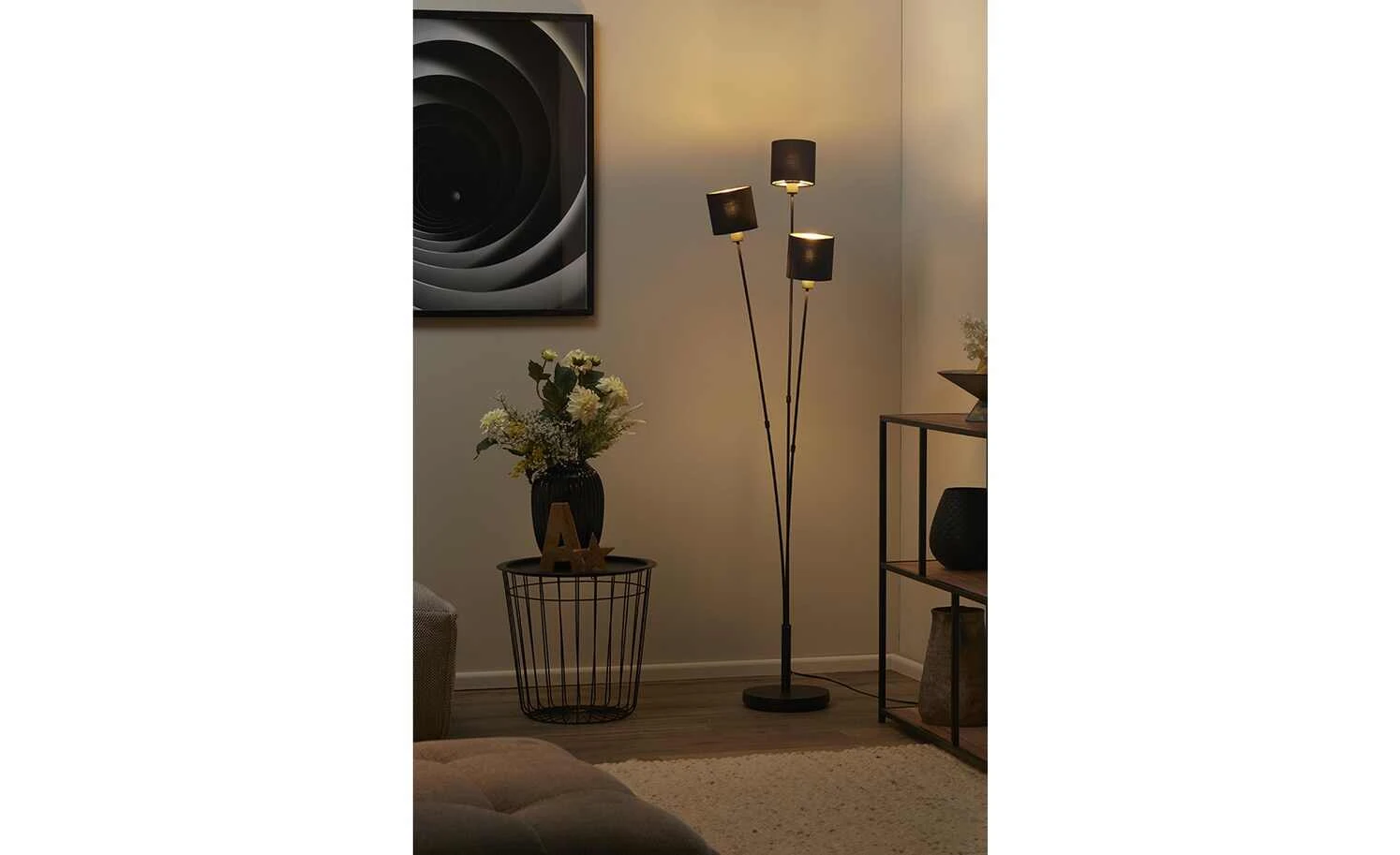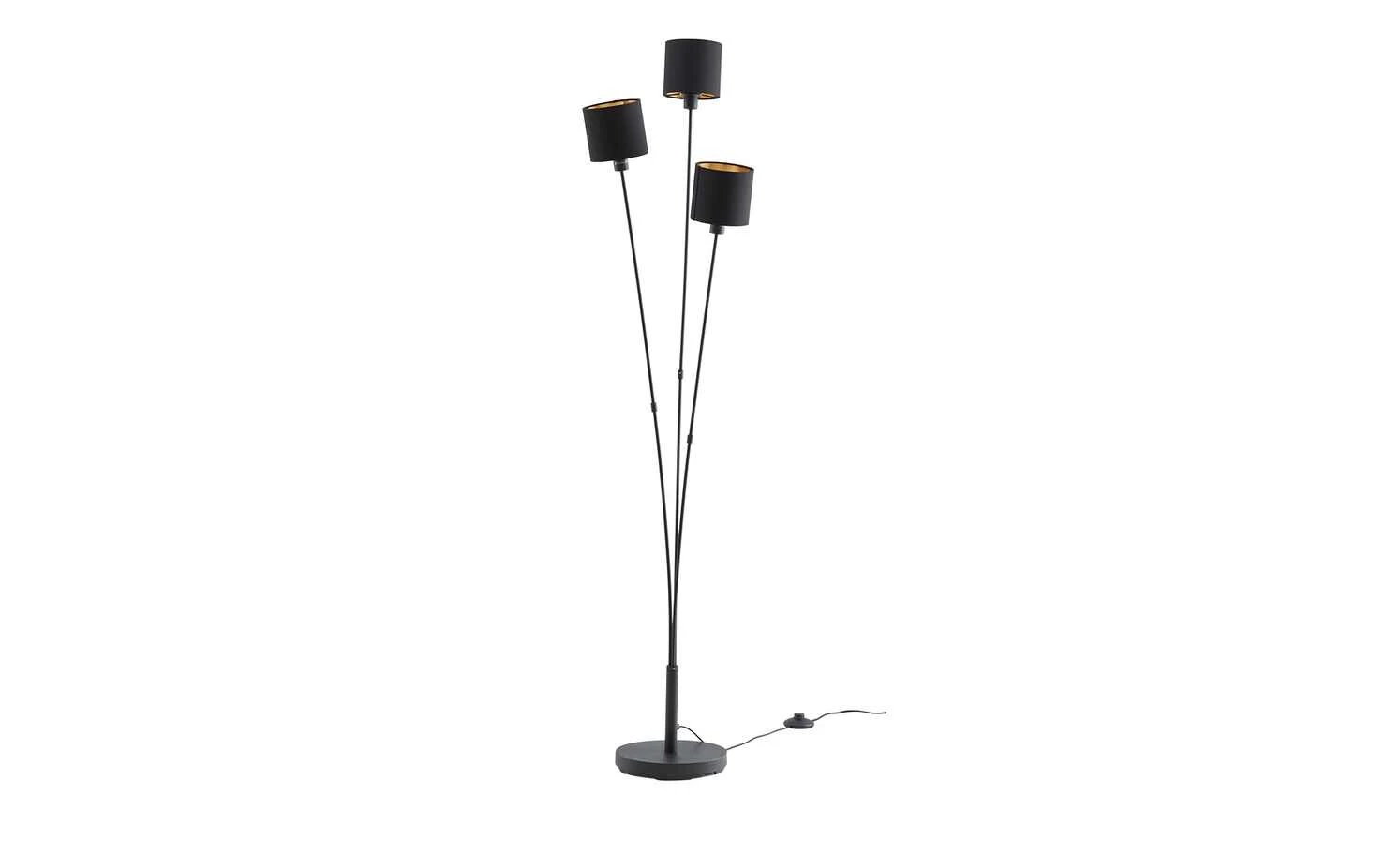 Trio Stehleuchte, 3-flammig, schwarz, Stoffschirm schwarz/gold