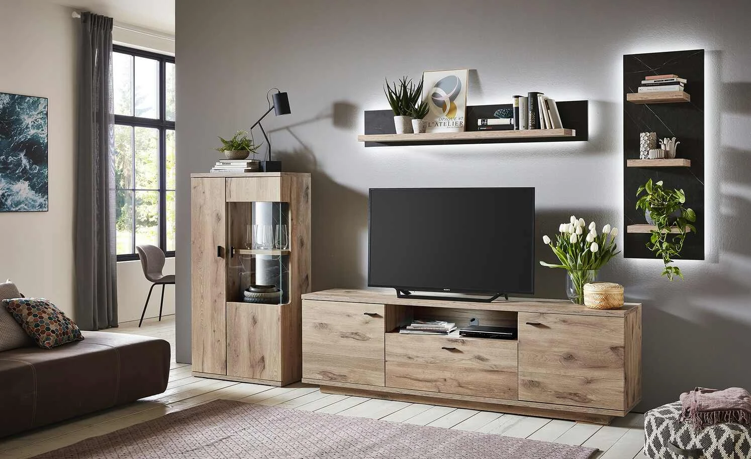 - Lieferumfang / mitgeliefertes Zubehör: LED-Streifenbeleuchtung für das Wandboard, 2er Set LED-Streifenbeleuchtung (je ca. 70 cm) für die Vitrine, LED-Streifenbeleuchtung für das Wandregal