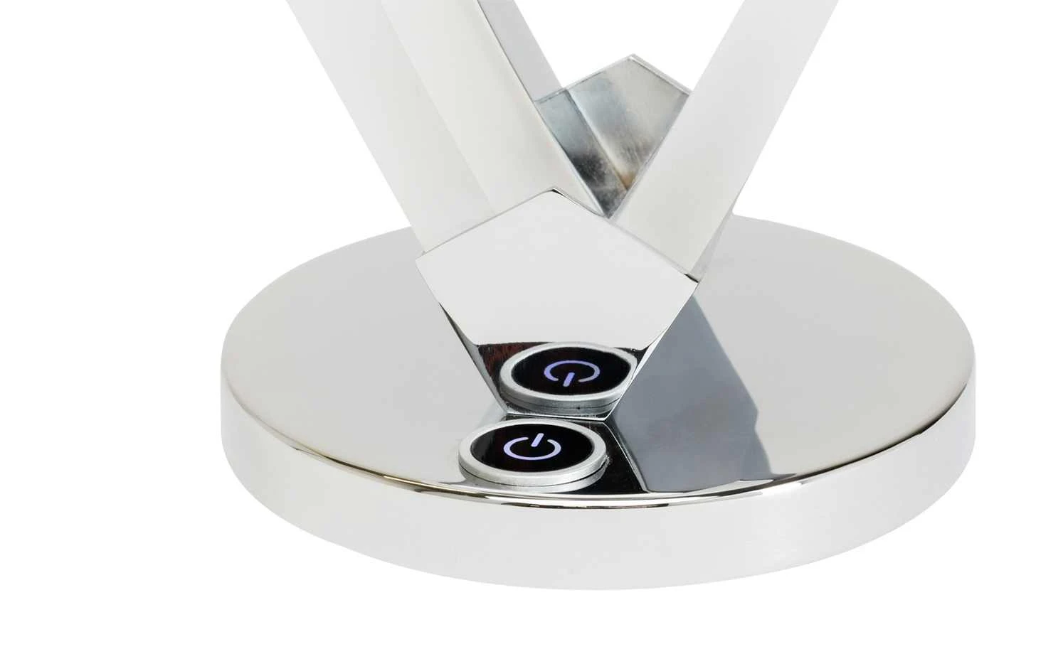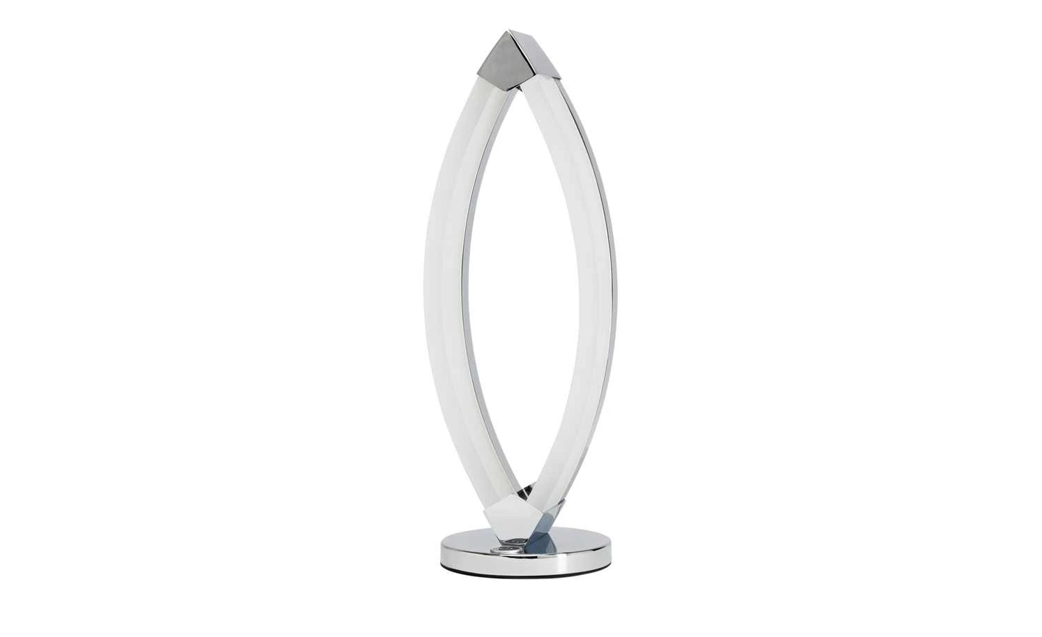Diese futuristisch anmutende LED-Tischleuchte präsentiert sich in außergewöhnlichem Design. Die Lampe thront auf einem runden Fuß aus verchromtem Metall und formt sich zu einer ovalen Lichtskulptur. Zwei nach außen gebogene Lichtleisten, die oben und unten zusammenlaufen und dort durch elegante Passstücke aus Metall zusammengehalten werden, bilden den Leuchtkörper. Der Luftraum in der Mitte zwischen den Bögen verleiht der Tischlampe eine gewisse Leichtigkeit und Transparenz. Ob als Teil der Dekoration auf dem Esstisch oder als Lichtquelle auf einem modernen Sideboard, durch ihre exklusive Formsprache wirkt diese LED-Tischleuchte selbst bereits als kunstvolles und dekoratives Objekt.